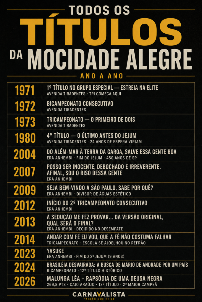 Com 13 títulos, a Mocidade Alegre é a segunda maior campeã da história do carnaval paulistano, atrás apenas da Vai-Vai (15). A diferença, que chegou a ser de 8 títulos nos anos 2000, foi sendo reduzida: em 2026, são apenas dois títulos de distância do recorde histórico. Se a escola mantiver o ritmo das últimas quatro temporadas — bicampeonato em 2023-24, 4º em 2025, campeã em 2026 — a conversa sobre o recorde absoluto é uma questão de poucos anos.